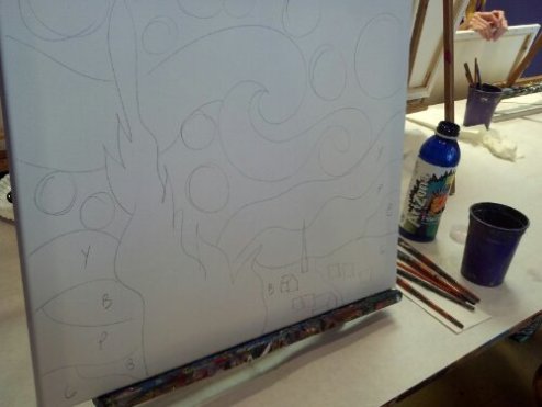 They always start you off with a blank canvas and the picture sketched onto it. This is the first time I’ve ever seen them give any guide to the colors and such on the canvas, but it was very helpful since there was a lot going on with this painting.