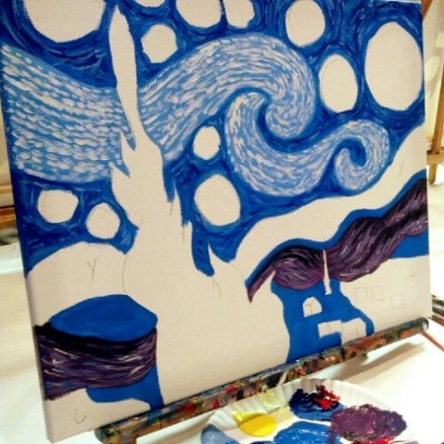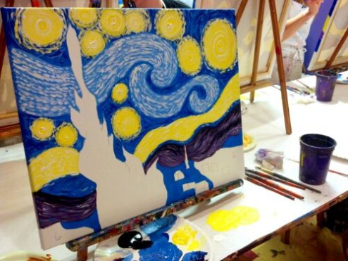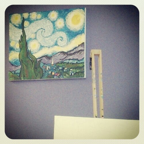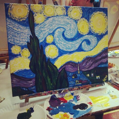 Friday night, I indulged in a fun evening of painting at Paint By the Glass. I’ve gone three other times, the last one being to paint a vibrant color rendition of Union Terminal in downtown Cincinnati. This time, my mom joined me to paint Van Gogh’s Starry Night.