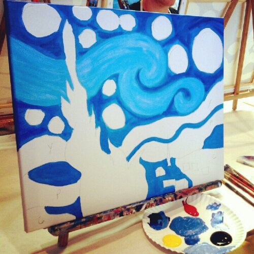 Blues are fun. This painting took a lot of blue. I mean, A LOT of blue. And yellow, but that comes later. You always start from the furthest thing back and come forward in the picture. We were supposed to do it all in flat colors, but I wanted to make mine with a little more texture before putting on the etch strokes. I like how it turned out.
