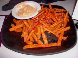 I cannot vouch for the hamburger that is mentioned above, but I will say that the descriptions match the dishes we ordered to a T. Our starter was, in fact, the sweet potato fries with ancho chile mayonnaise. I was never a fan of sweet potato until living in Japan (they have a way with potato and squashes) and I have only seen sweet potato fries in the last two years. I LOVE them and these were no disappointment. I do not usually eat mayo, but the ancho was irresistible.