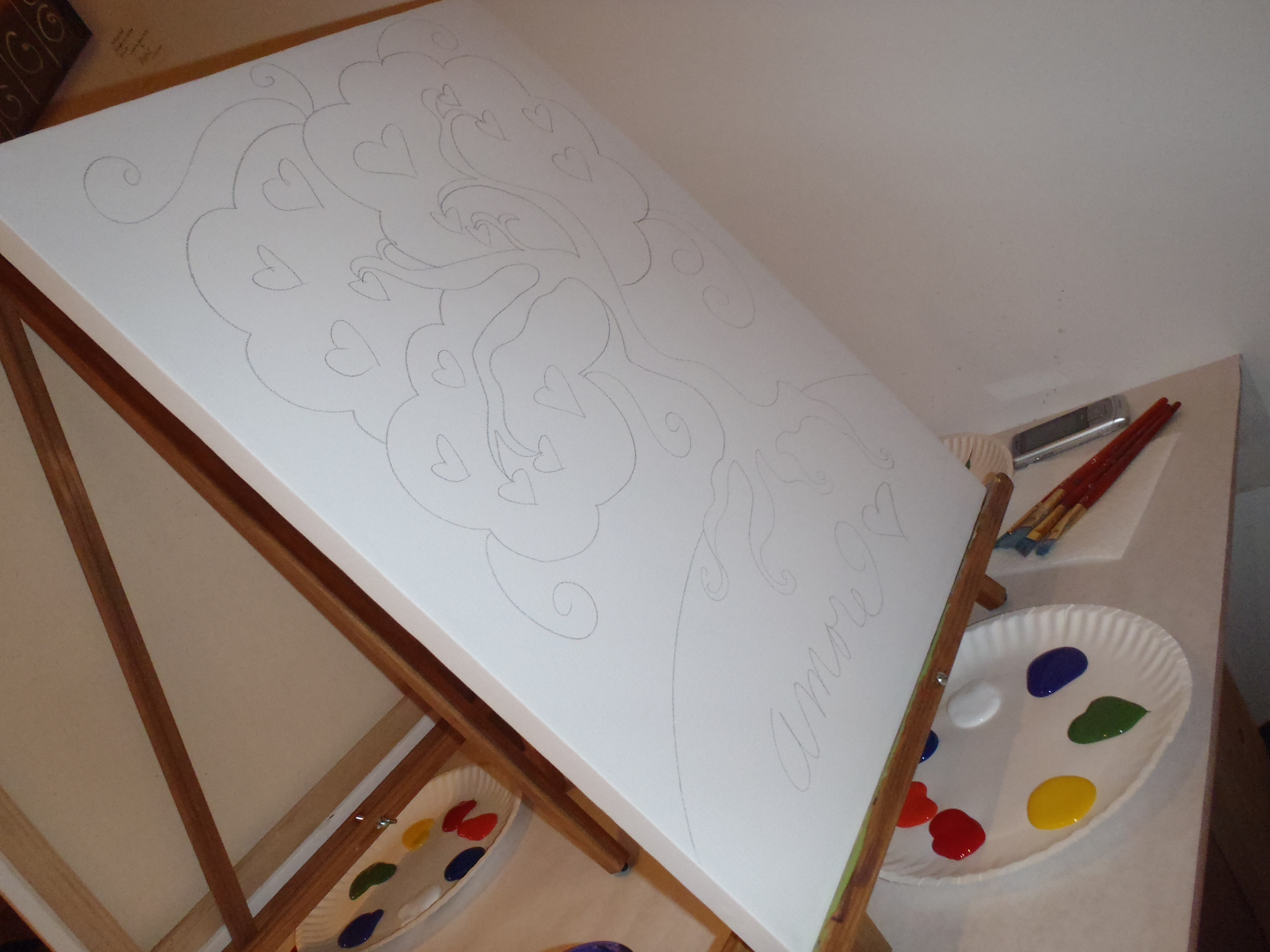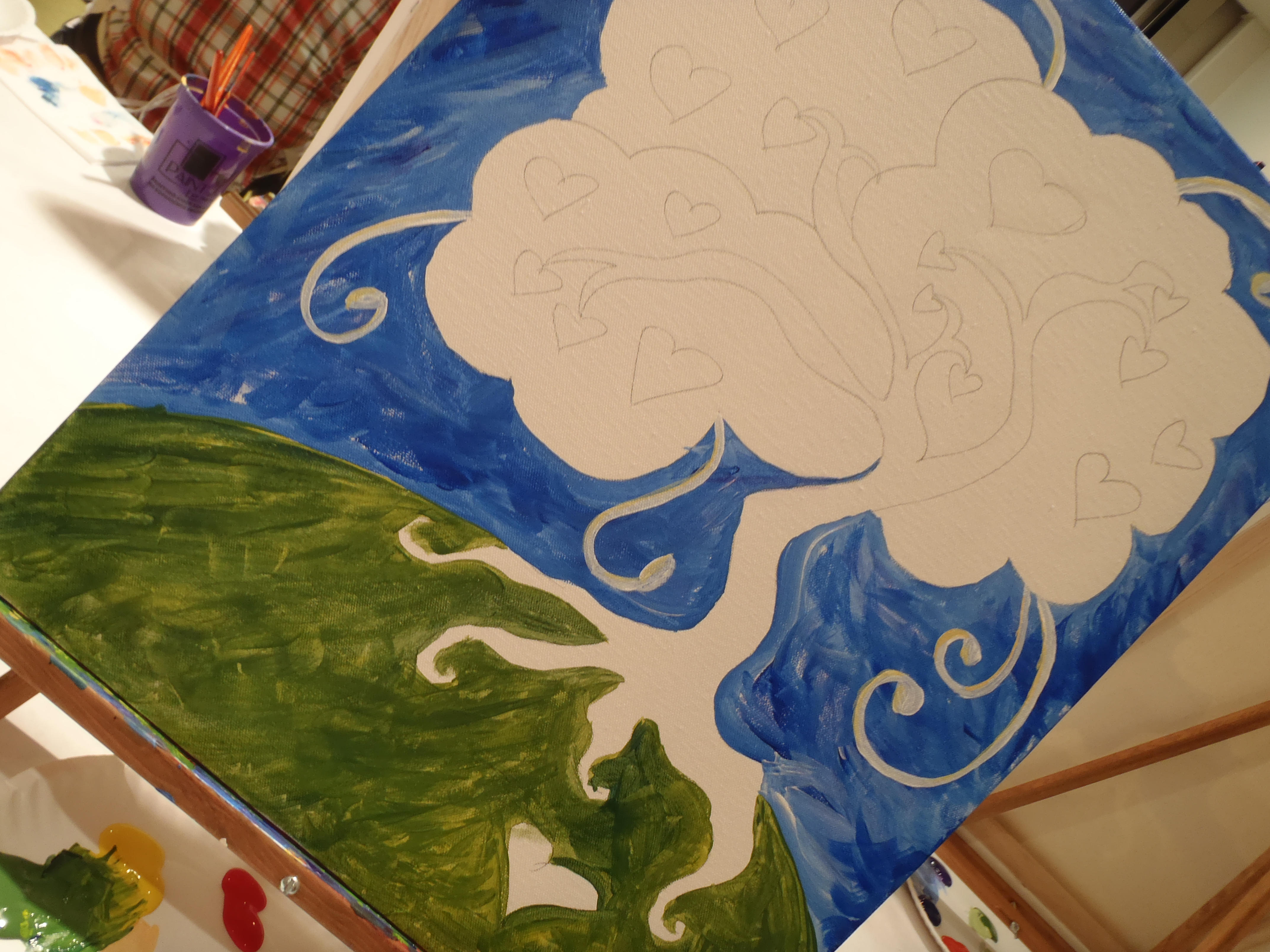 At each table there was an easel with an unpainted canvas, an assortment of brushes, and a plate with all the primary/secondary colors and white. Oh, and of course, a cup of water. On the canvas, as shown to the right, the basic picture is sketched in pencil, so it’s like a paint-by-number without the numbers. I wasn’t sure how I would feel about that, but it was really nice.