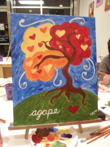 My friend, Lanna and I went the Saturday before Valentine’s Day and had a really great time. The painting was called “Love Tree”, for obvious reasons. I was surprised to see so many men there, but it was a predominantly Valentine’s Day theme, so, I’m sure many of the guys were forced into it. I did see one couple in particular, where the guy was just observing his SO painting and didn’t seem to be much preoccupied with anything else. Anyways, since I’m not really a fan of Valentine’s Day, to spend an evening doing something crafty with my best friend was all I could have asked for this year! We also sat at a table with a cool, trendy Christian couple and had a lot of fun talking and joking with them.