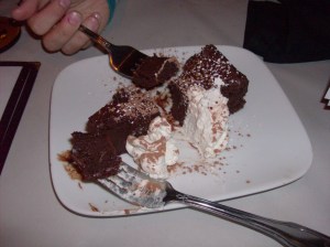There is no dessert menu and the options are sort of limited…but if you hear your server say the three most beautiful words – Chocolate Bourbon Torte – place your order right away. Lans and I shared a slice of it and, though I missed the proper “before” shot, I’m sure this one gives you an idea of the deliciousness.
