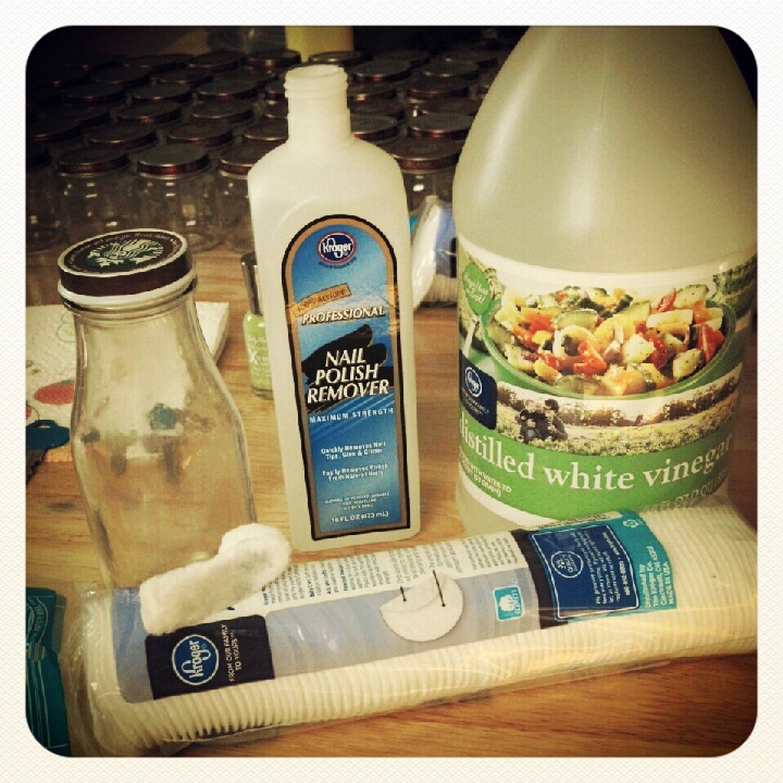 The tools. I will say right now that the acetone worked above and beyond the best. I don’t like vinegar because I’m allergic to it, but you know, it’s said to have amazing abilities at, oh, everything. So I gave it a try. It was a fail. Nail polish remover was the best. Our hands were a little sticky following, but that washed off. Fumes weren’t too bad either.