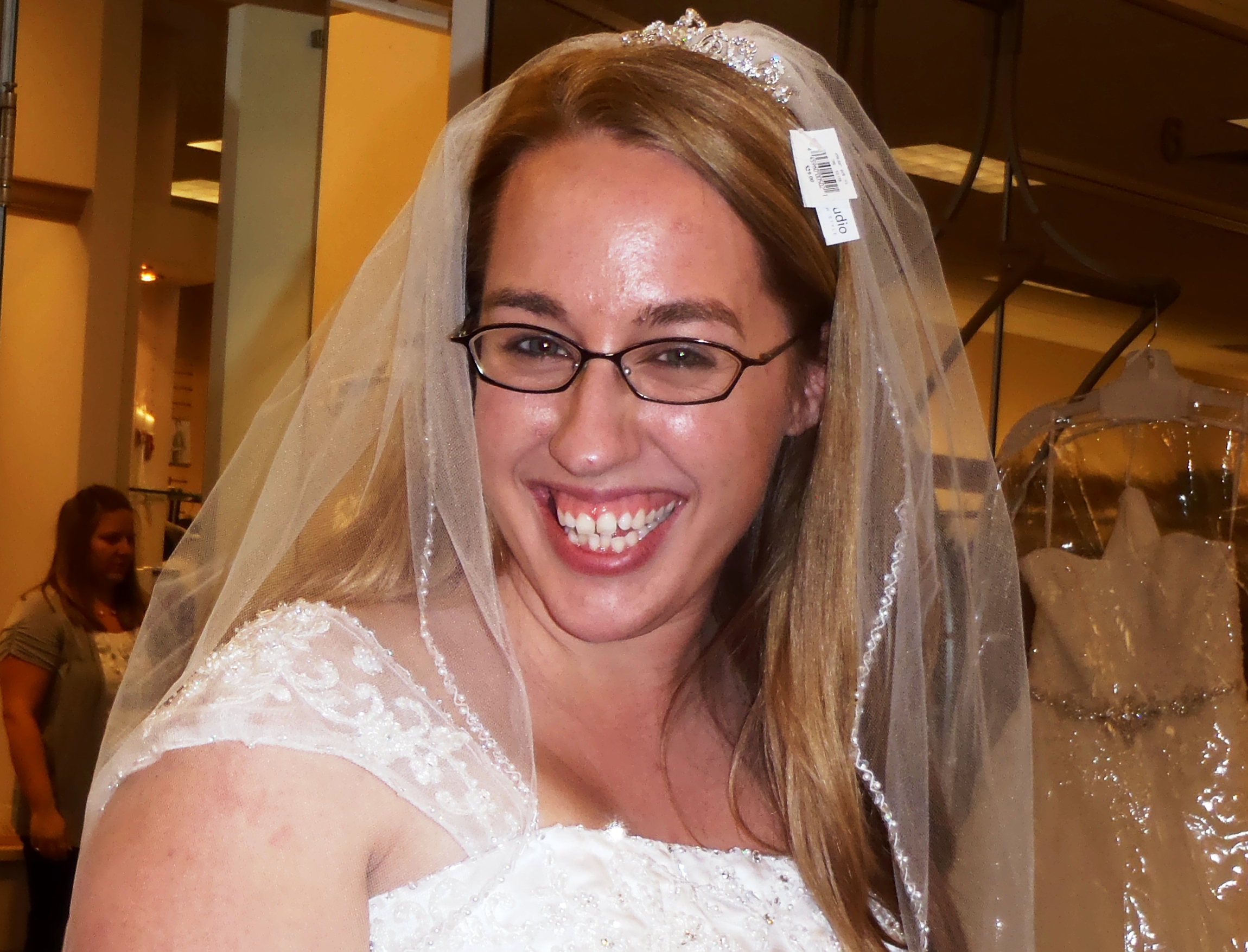 Tuesday night, Mom and I lugged my wedding dress and accessory clothing to David’s Bridal for my first fitting! It was pretty fun and informative. My dress is so gorgeous and detailed…that means alterations are going to be a bear. We actually have to go back at the end of April for a Part Two because she could only focus on the top part and not the hem. That’s right. I might be long-waisted, but I’m still short and the back was way too loose. The dress looked so pretty when I first tried it on, but it felt wonderful after she clipped it up to the right dimensions on the top.