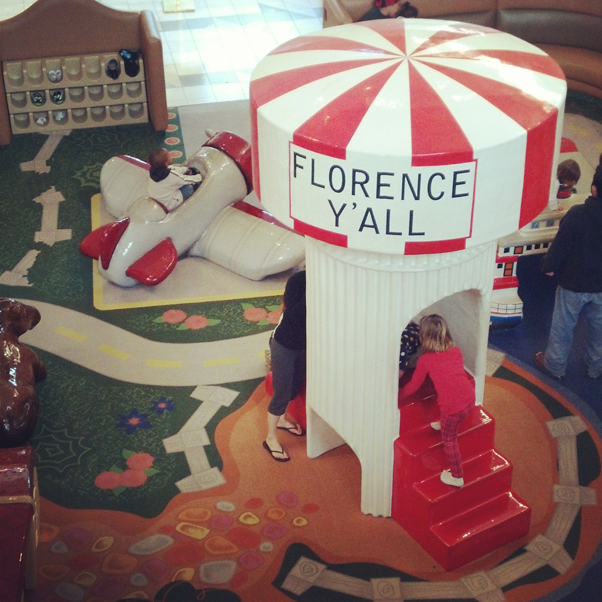 We stopped over at Florence Mall to do a little shopping. I found some cute things for certain people who are going to be in a certain big event of mine. Ahem. Also, we found a replica of the water tower nearby in the kids area.
